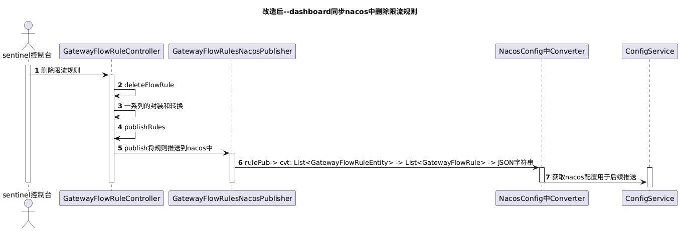 @startuml title 改造后--dashboard同步nacos中删除限流规则 actor "sentinel控制台" as dashboard participant "GatewayFlowRuleController" as ruleCtl participant "GatewayFlowRulesNacosPublisher" as rulePub participant "NacosConfig中Converter" as cvt participant "ConfigService" as configSer autonumber activate dashboard dashboard-> ruleCtl: 删除限流规则 activate ruleCtl ruleCtl-> ruleCtl: deleteFlowRule ruleCtl-> ruleCtl: 一系列的封装和转换 ruleCtl-> ruleCtl: publishRules ruleCtl-> rulePub: publish将规则推送到nacos中 activate rulePub rulePub-> cvt: rulePub-> cvt: List<GatewayFlowRuleEntity> -> List<GatewayFlowRule> -> JSON字符串 activate cvt activate configSer cvt-> configSer: 获取nacos配置用于后续推送 deactivate cvt deactivate rulePub deactivate ruleCtl deactivate dashboard @enduml