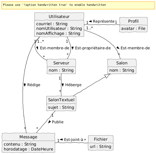 @startuml skinparam style strictuml skinparam backgroundcolor transparent skinparam defaultfontname xkcd Script skinparam handwritten true scale 1 hide empty members Utilisateur "1" -- "*" Message : Rédige > SalonTextuel "1" -- "*" Message : Publie > Profil "1" -left- "1" Utilisateur : Représente > Utilisateur "1..*" -- "*" Serveur : Est-membre-de > Utilisateur "1" -- "*" Serveur : Est-propriétaire-de > Serveur "1" -- "*" SalonTextuel : Héberge > Message "1" -right- "*" Fichier : < Est-joint-à Utilisateur "1..*" -- "*" Salon : Est-membre-de > class Message { contenu : String horodatage : DateHeure } class Utilisateur { courriel : String nomUtilisateur : String nomAffichage : String } class Salon { nom : String } class SalonTextuel extends Salon { sujet : String } class Serveur { nom : String } class Profil { avatar : File } class Fichier { url : String } @enduml