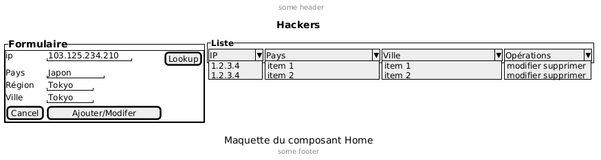 @startsalt {{^==Formulaire title Hackers header some header \t\t\t\t\t\t\t\t\t\t\t\t\t\t\t\t footer some footer caption Maquette du composant Home {+ ip | "103.125.234.210"|[Lookup] Pays | "Japon " Région | "Tokyo " Ville | "Tokyo " [Cancel] | [ Ajouter/Modifer ] }}| { } | {^<b>Liste { ^ IP ^^ 1.2.3.4^ 1.2.3.4^^ | ^Pays ^^ item 1^^ item 2^ | ^Ville ^ item 1^ item 2^ | ^Opérations ^ modifier supprimer^ modifier supprimer^ | } } } @endsalt