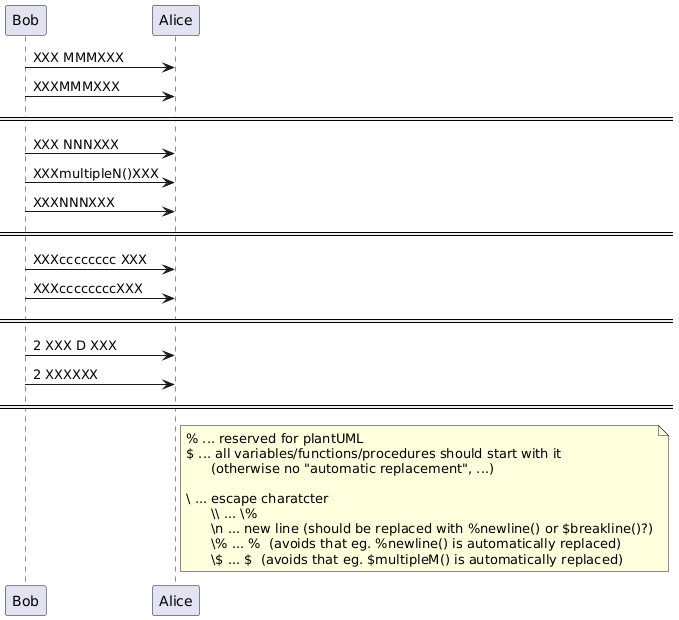 @startuml !function $multipleM() !return "MMM" !endfunction !function multipleN() !return "NNN" !endfunction !$C=cccccccc !C=ddddddd ' missing $ -> $ has to be used Bob -> Alice : XXX $multipleM()XXX Bob -> Alice : XXX$multipleM()XXX ==== Bob -> Alice : XXX multipleN()XXX ' user should follow the $ rule Bob -> Alice : XXXmultipleN()XXX ' but he still has a workaround !$msg="XXX" + multipleN() + "XXX" Bob -> Alice : $msg ==== Bob -> Alice : XXX$C XXX Bob -> Alice : XXX%get_variable_value("$C")XXX ==== Bob -> Alice : 2 XXX D XXX Bob -> Alice : 2 XXX%get_variable_value("D")XXX ==== note right of Alice % ... reserved for plantUML $ ... all variables/functions/procedures should start with it (otherwise no "automatic replacement", ...) \ ... escape charatcter \\ ... \% %newline() \n ... new line (should be replaced with %chr(37)newline() or %chr(36)breakline()?) \% ... % (avoids that eg. %chr(37)newline() is automatically replaced) \$ ... $ (avoids that eg. %chr(36)multipleM() is automatically replaced) end note @enduml
