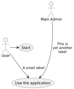 @startuml User -> (Start) User --> (Use the application) : A small label :Main Admin: ---> (Use the application) : This is\nyet another\nlabel @enduml
