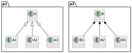 @startuml set namespaceSeparator none package p1{ class A{ } class A1{ } class A2{ } class A3{ } } package p2{ class B{ } class B1{ } class B2{ } class B3{ } } A <|-- A1 A <|-- A2 A <|-- A3 B *-- B1 B *-- B2 B *-- B3 @enduml