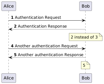@startuml autonumber Alice -> Bob: Authentication Request Bob --> Alice: Authentication Response autonumber inc note over Bob: %autonumber% instead of 3 Alice -> Bob: Another authentication Request Alice <-- Bob: Another authentication Response note over Bob: %autonumber% @enduml