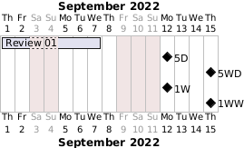 @startgantt Project starts 2022-09-01 saturdat are closed sunday are closed 2022-09-09 is closed [Review 01] lasts 5 days 'Should read as [Review 01] requires 5 days [5D] happens on 5 days after [Review 01]'s end [5WD] happens on 5 working days after [Review 01]'s end [1W] happens on 1 week after [Review 01]'s end [1WW] happens on 1 working week after [Review 01]'s end @endgantt