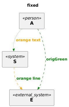 @startuml title fixed skinparam arrow { Color green FontColor green } skinparam arrow<<orangeText>> { Color ;text:orange;line.dotted } skinparam arrow<<orangeLine>> { Color orange;line.dashed } skinparam arrow<<origGreen>> { Color ;line.dashed } rectangle "==A" <<person>> as a rectangle "==S" <<system>> as s rectangle "==E" <<external_system>> as e a -->> s <<orangeText>> : **orange text** s -->> e <<orangeLine>> : **orange line** a -->> e <<origGreen>> : **origGreen** @enduml