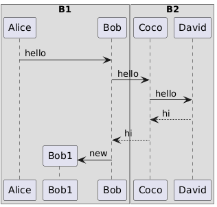 @startuml box B1 participant Alice order 10 participant Bob order 20 ' add it here <---------------- participant Bob1 order 19 end box box B2 participant Coco order 30 participant David order 40 end box Alice -> Bob: hello Bob -> Coco: hello Coco -> David : hello return hi Coco -->Bob:hi ' you can create it here <---------------- create Bob1 Bob->Bob1:new @enduml