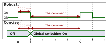 @startuml robust "Robust" as RobustOn concise "Concise" as ConciseState RobustOn is Off ConciseState is "Off" @0 as :On_Start @1 as :On @5 as :On_Start2 @6 as :On2 @:On_Start RobustOn is On @:On RobustOn is Off ConciseState is "Global switching On" @:On_Start2 RobustOn is On @:On2 RobustOn is Off RobustOn@:On_Start <-> @:On : 1000 ms RobustOn@:On <-> @:On_Start2: The comment ConciseState@:On_Start <-> @:On : 1000 ms ConciseState@:On <-> @:On_Start2: The comment @enduml