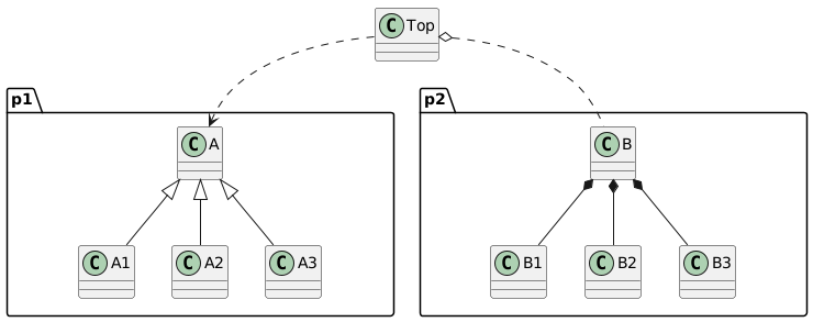 @startuml set namespaceSeparator none class Top{ } package p1{ class A { } class A1{ } class A2{ } class A3{ } A -left- dummyA1 A -right- dummyA2 hide dummyA1 hide dummyA2 } package p2{ class B{ } class B1{ } class B2{ } class B3{ } B -left- dummyB1 B -right- dummyB2 hide dummyB1 hide dummyB2 } Top ..> A Top o.. B A <|-- A1 A <|-- A2 A <|-- A3 B *-- B1 B *-- B2 B *-- B3 @enduml