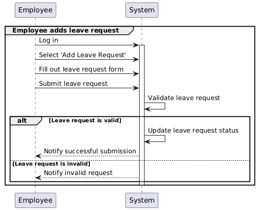 @startuml participant Employee participant System group Employee adds leave request Employee -> System: Log in activate System Employee -> System: Select 'Add Leave Request' Employee -> System: Fill out leave request form Employee -> System: Submit leave request System -> System: Validate leave request alt Leave request is valid System -> System: Update leave request status System --> Employee: Notify successful submission else Leave request is invalid System --> Employee: Notify invalid request end deactivate System end @enduml