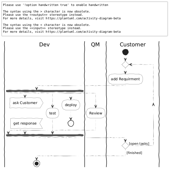 @startuml skinparam DefaultFontName "FG Virgil" skinparam handwritten true skinparam monochrome true skinparam packageStyle rect skinparam shadowing false skinparam Activity{ BackgroundColor snow BorderColor DarkSlateBlue DiamondBackgroundColor ghostwhite DiamondBorderColor DarkSlateBlue } skinparam Note{ BorderColor DarkSlateBlue BackgroundColor LightYellow } skinparam ArrowColor DarkSlateBlue |Dev| |QM| |Customer| start repeat :add Requirment; |Dev| fork |QM| :Review; |Dev| fork again :ask Customer> Detach :get response< fork again :test; fork again :deploy; end |Dev| end fork |Customer| repeat while () is ([open tasks]) ->[finished]; |Dev| stop @enduml