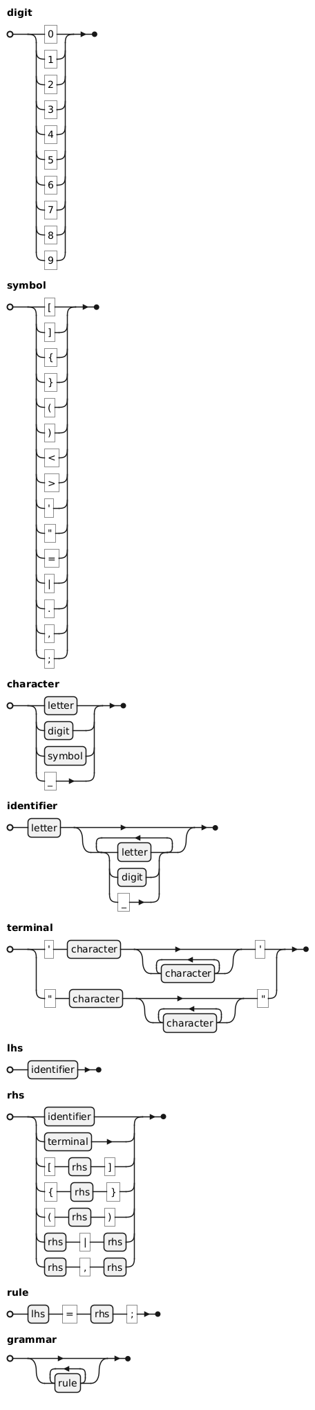 @startebnf digit = "0" | "1" | "2" | "3" | "4" | "5" | "6" | "7" | "8" | "9" ; symbol = "[" | "]" | "{" | "}" | "(" | ")" | "<" | ">" | "'" | '"' | "=" | "|" | "." | "," | ";" ; character = letter | digit | symbol | "_" ; identifier = letter , { letter | digit | "_" } ; terminal = "'" , character , { character } , "'" | '"' , character , { character } , '"' ; lhs = identifier ; rhs = identifier | terminal | "[" , rhs , "]" | "{" , rhs , "}" | "(" , rhs , ")" | rhs , "|" , rhs | rhs , "," , rhs ; rule = lhs , "=" , rhs , ";" ; grammar = { rule } ; @endebnf