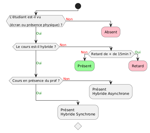 @startuml !pragma useVerticalIf on 'scale 1020x4000 start if (L'étudiant est-il vu \n\n(écran ou présence physique) ?) then (<color:red>Non) #pink:Absent; kill (<color:green>Oui) elseif (Le cours est-il hybride ?) then (<color:red>Non) if (Retard de + de 15min ?) then (<color:red>Non) #palegreen:Présent; kill else (<color:green>Oui) #pink:Retard; endif kill (<color:Green>Oui) elseif (Cours en présence du prof ?) then (<color:red>Non) :Présent \nHybride Asynchrone; kill else (<color:green>Oui) :Présent \nHybride Synchrone; kill endif @enduml