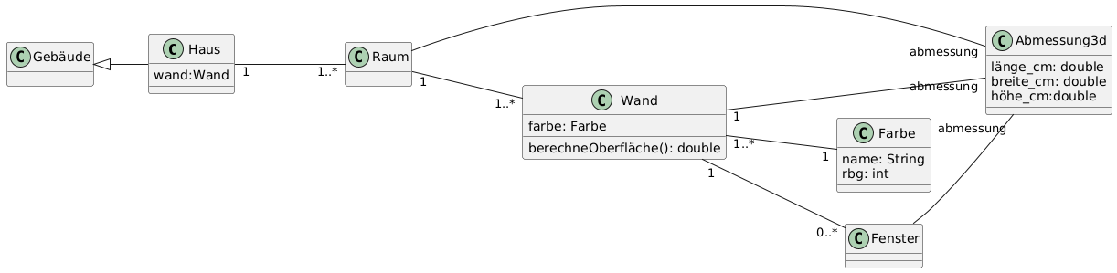 @startuml left to right direction 'top to bottom direction class Haus { wand:Wand } class Raum { } Raum ---"abmessung" Abmessung3d class Abmessung3d{ länge_cm: double breite_cm: double höhe_cm:double } class Wand { farbe: Farbe berechneOberfläche(): double } Wand "1"--"abmessung" Abmessung3d class Farbe { name: String rbg: int } class Fenster Fenster --"abmessung" Abmessung3d class Gebäude Gebäude <|--Haus Haus "1"--- "1..*" Raum Raum "1"---"1..*" Wand Wand "1"---"0..*" Fenster Wand "1..*"---"1" Farbe @enduml