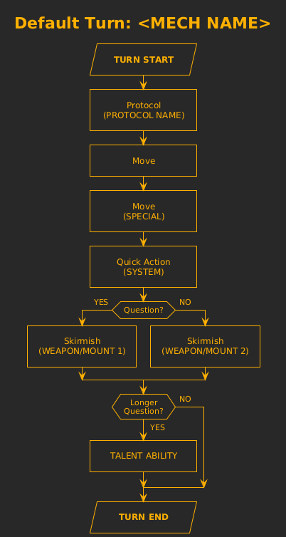 @startuml '---DO NOT MODIFY YET--- !theme crt-amber skinparam DefaultTextAlignment center skinparam ConditionEndStyle hline skinparam Padding 5 <style> activity { MinimumWidth 150 } </style> '---CHANGE THE LINE BELOW--- title Default Turn: <MECH NAME> :**TURN START**; <<save>> '---START MODIFYING HERE--- :Protocol (PROTOCOL NAME); <<task>> :Move; <<task>> :Move (SPECIAL); <<task>> :Quick Action (SYSTEM); <<task>> if (Question?) then (YES) :Skirmish (WEAPON/MOUNT 1); <<task>> else (NO) :Skirmish (WEAPON/MOUNT 2); <<task>> endif if (Longer Question?) then (YES) :TALENT ABILITY; <<task>> else (NO) endif '---STOP MODIFYING HERE--- :**TURN END**; <<save>> @enduml