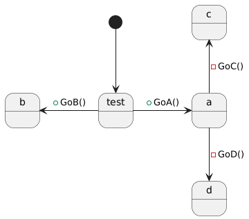 @startuml [*] --> test test -> a : +GoA() test -left-> b : +GoB() a -up-> c : -GoC() a --> d : -GoD() @enduml