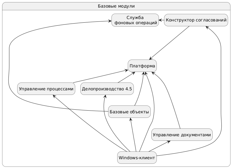 @startuml hide empty description '!pragma layout elk skinparam rectangleBorderThickness 1 skinparam defaultTextAlignment center skinparam lifelineStrategy solid skinparam monochrome true State "Базовые модули" as base { State "Платформа" as platform State "Базовые объекты" as baseobjects State "Управление процессами" as workflow State "Управление документами" as documentmanagement State "Конструктор согласований" as approvaldesigner State "Делопроизводство 4.5" as takeoffice State "Windows-клиент" as windowsclient State "Служба\n фоновых операций" as worker } platform <--down- baseobjects platform <-down- workflow platform <-down- takeoffice platform <--down--- windowsclient platform <--down-- documentmanagement platform <--down-- approvaldesigner windowsclient --left---> approvaldesigner windowsclient --left---> documentmanagement windowsclient -left---> baseobjects windowsclient --left--> takeoffice windowsclient -left-> workflow baseobjects <-[hidden]up- documentmanagement documentmanagement <-[hidden]down- approvaldesigner approvaldesigner <-[hidden]up- documentmanagement platform <-[hidden]up- takeoffice platform <-[hidden]up- workflow platform <-[hidden]up-- baseobjects platform -[hidden]down--> worker documentmanagement <-[hidden]down- worker worker <--left-- approvaldesigner worker <--left-- baseobjects @enduml