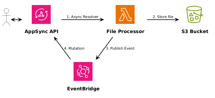 @startuml !define AWSPuml https://raw.githubusercontent.com/awslabs/aws-icons-for-plantuml/v20.0/dist !includeurl AWSPuml/AWSCommon.puml !include AWSPuml/AWSSimplified.puml !includeurl AWSPuml/ApplicationIntegration/AppSync.puml !includeurl AWSPuml/Compute/Lambda.puml !includeurl AWSPuml/Storage/SimpleStorageServiceBucketWithObjects.puml !includeurl AWSPuml/ApplicationIntegration/EventBridge.puml actor user as "User" AppSync(api, "AppSync API", "") #transparent Lambda(generateFile, "File Processor", "") #transparent EventBridge(eventBus, "EventBridge", "") #transparent SimpleStorageServiceBucketWithObjects(bucket, "S3 Bucket", "") #transparent user <-> api api -> generateFile: 1. Async Resolver generateFile -> bucket: 2. Store file generateFile -down-> eventBus: 3. Publish Event eventBus -> api: 4. Mutation @enduml