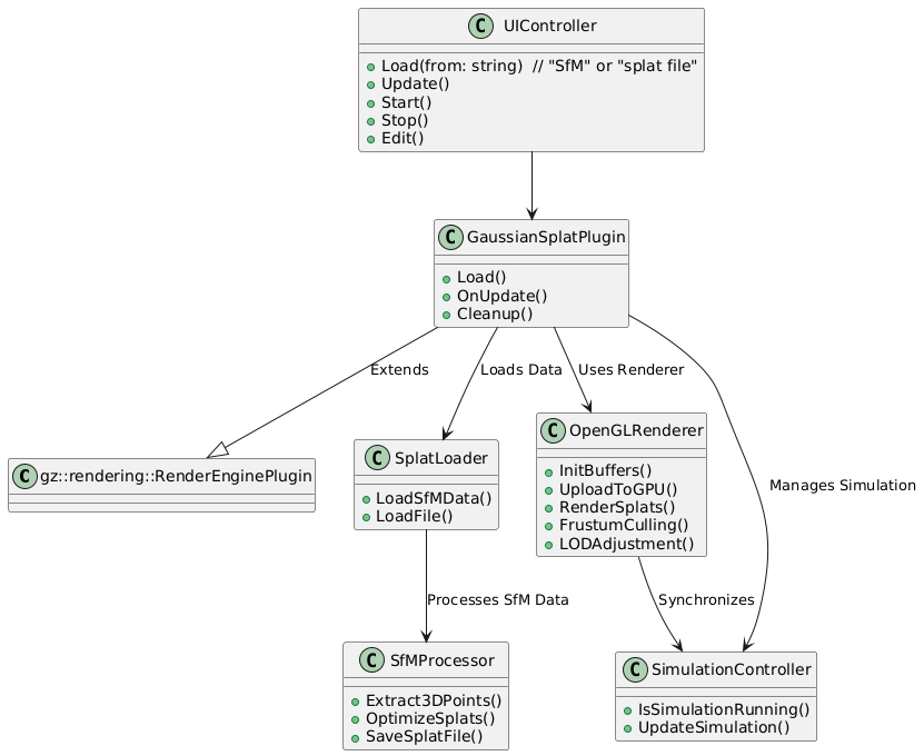 @startuml class "gz::rendering::RenderEnginePlugin" { } class GaussianSplatPlugin { + Load() + OnUpdate() + Cleanup() } class SplatLoader { + LoadSfMData() + LoadFile() } class SfMProcessor { + Extract3DPoints() + OptimizeSplats() + SaveSplatFile() } class OpenGLRenderer { + InitBuffers() + UploadToGPU() + RenderSplats() + FrustumCulling() + LODAdjustment() } class SimulationController { + IsSimulationRunning() + UpdateSimulation() } class UIController { + Load(from: string) // "SfM" or "splat file" + Update() + Start() + Stop() + Edit() } GaussianSplatPlugin --|> "gz::rendering::RenderEnginePlugin" : "Extends" GaussianSplatPlugin --> SplatLoader : "Loads Data" SplatLoader --> SfMProcessor : "Processes SfM Data" GaussianSplatPlugin --> OpenGLRenderer : "Uses Renderer" GaussianSplatPlugin --> SimulationController : "Manages Simulation" OpenGLRenderer --> SimulationController : "Synchronizes" UIController --> GaussianSplatPlugin @enduml