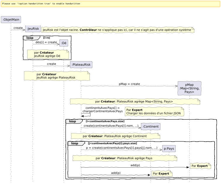 @startuml skinparam style strictuml skinparam backgroundcolor transparent skinparam defaultfontname xkcd Script skinparam handwritten true scale 0.75 skinparam sequenceMessageAlign center participant ":ObjetMain" as outside participant ":JeuRisk" as jr participant ":Dé" as d participant ":PlateauRisk" as pr participant ":Continent" as c participant "p:Pays" as p participant "pMap\n:Map<String,\nPays>" as m create jr outside -->> jr : create note right: JeuRisk est l'objet racine. **Contrôleur** ne s'applique pas ici, car il ne s'agit pas d'une opération système loop i<5 create d jr -->> d : dés[i] = create note over jr,d: par **Créateur**\nJeuRisk agrège Dé end loop create pr jr -->> pr : create note over jr,pr: par **Créateur**\nJeuRisk agrège PlateauRisk create m pr -->> m : pMap = create note over pr,m: par **Créateur**: PlateauRisk agrège Map<String, Pays> pr -> pr : continentsAvecPays[] =\nchargerContinentsAvecPays note right : Par **Expert**\nCharger les données d'un fichier JSON loop i<continentsAvecPays.size create c pr -->> c : create(continentsAvecPays[i].nom, ...) note over pr,c: par **Créateur**: PlateauRisk agrège Continent loop j<continentsAvecPays[i].pays.size create p pr -->> p : p = create(continentsAvecPays[i].pays[j].nom, ...) note over pr,p: par **Créateur**: PlateauRisk agrège Pays pr -> m : add(p) note right: Par **Expert** pr -> c : add(p) note right: Par **Expert** end loop end loop @enduml