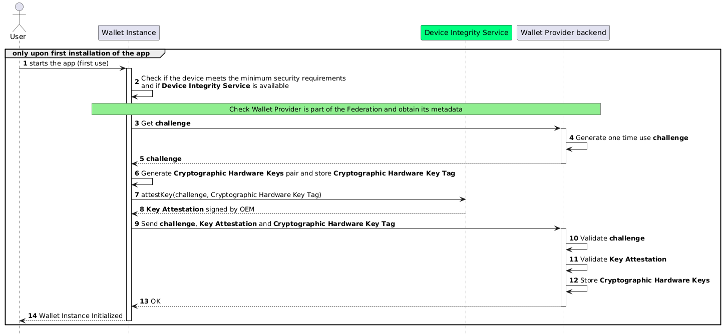 @startuml autonumber hide footbox 'participant actor "User" as user participant "Wallet Instance" as app participant "Device Integrity Service" as aats #springgreen participant "Wallet Provider backend" as bck group only upon first installation of the app user->app: starts the app (first use) activate app app->app: Check if the device meets the minimum security requirements\nand if **Device Integrity Service** is available rnote over app,bck #LIGHTGREEN Check Wallet Provider is part of the Federation and obtain its metadata endrnote app->bck: Get **challenge** activate bck bck->bck: Generate one time use **challenge** bck-->app: **challenge** deactivate bck app->app: Generate **Cryptographic Hardware Keys** pair and store **Cryptographic Hardware Key Tag** app->aats: attestKey(challenge, Cryptographic Hardware Key Tag) aats-->app: **Key Attestation** signed by OEM app->bck: Send **challenge**, **Key Attestation** and **Cryptographic Hardware Key Tag** activate bck bck->bck: Validate **challenge** bck->bck: Validate **Key Attestation** bck->bck: Store **Cryptographic Hardware Keys** bck-->app: OK deactivate bck app-->user: Wallet Instance Initialized deactivate app end @enduml