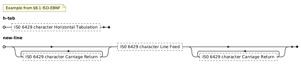 @startebnf (* Example from §8.1 ISO-EBNF *) h-tab = ? IS0 6429 character Horizontal Tabulation ? ; new-line = { ? IS0 6429 character Carriage Return ? }, ? IS0 6429 character Line Feed ?, { ? IS0 6429 character Carriage Return ? }; @endebnf