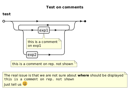 @startebnf title Test on comments test = {exp1 (*this is a comment\non exp1*) | exp2} (*this is a comment on rep. not shown*); (* The real issue is that we are not sure about **where** should be displayed <code> this is a comment on rep. not shown </code> Just tell us <:1f600:> *) @endebnf