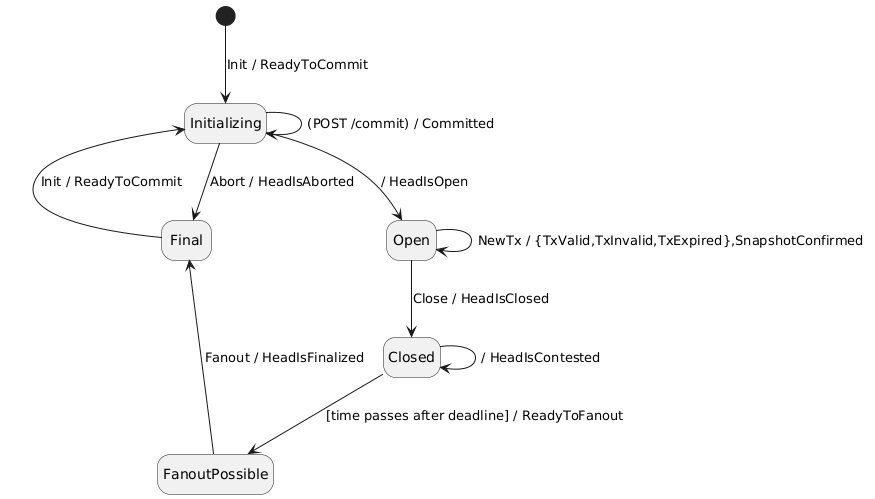 @startuml hide empty description [*] --> Initializing : Init / ReadyToCommit Initializing -> Initializing : (POST /commit) / Committed Initializing --> Final : Abort / HeadIsAborted Initializing --> Open : / HeadIsOpen Open -> Open : NewTx / {TxValid,TxInvalid,TxExpired},SnapshotConfirmed Open --> Closed : Close / HeadIsClosed Closed -> Closed : / HeadIsContested Closed --> FanoutPossible : [time passes after deadline] / ReadyToFanout FanoutPossible -left-> Final : Fanout / HeadIsFinalized Final -left-> Initializing : Init / ReadyToCommit @enduml