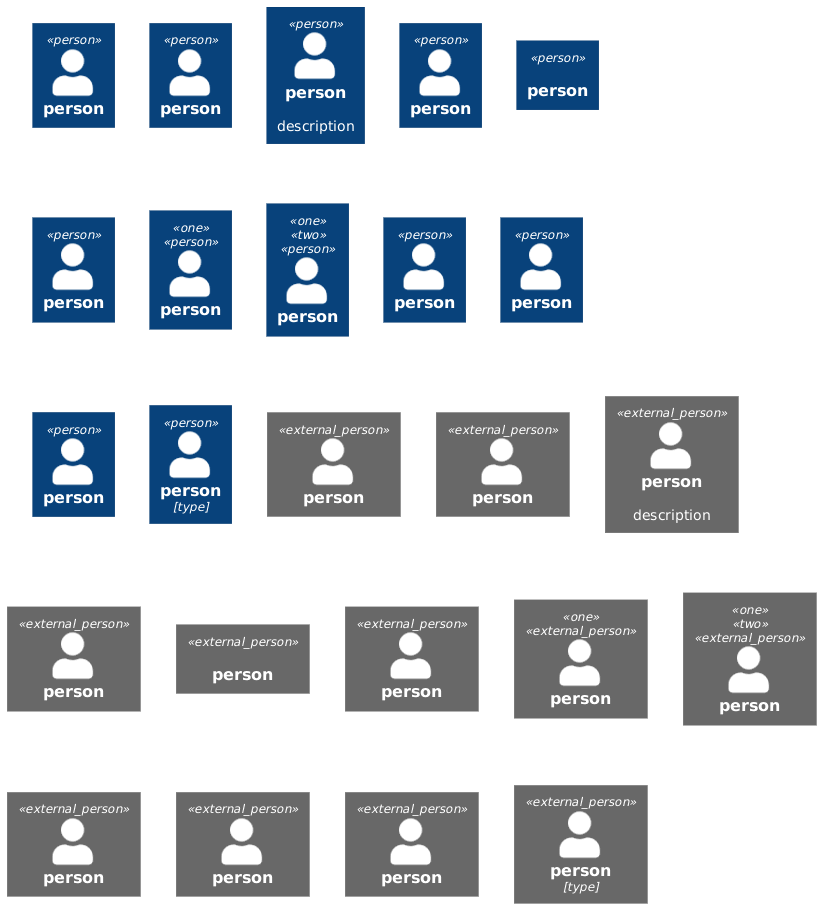 @startuml !include https://raw.githubusercontent.com/plantuml-stdlib/C4-PlantUML/master/C4_Container.puml Person(person, "person") Person(person_descr_empty, "person", $descr="") Person(person_descr, "person", $descr="description") Person(person_sprite_empty, "person", $sprite="") Person(person_sprite, "person", $sprite="osa_user_black_hat") Person(person_tags_empty, "person", $tags="") Person(person_tags_one, "person", $tags="one") Person(person_tags_two, "person", $tags="one+two") Person(person_link_empty, "person", $link="") Person(person_link, "person", $link="https://test.com") Person(person_type_empty, "person", $type="") Person(person_type, "person", $type="type") Person_Ext(person_ext, "person") Person_Ext(person_ext_descr_empty, "person", $descr="") Person_Ext(person_ext_descr, "person", $descr="description") Person_Ext(person_ext_sprite_empty, "person", $sprite="") Person_Ext(person_ext_sprite, "person", $sprite="osa_user_black_hat") Person_Ext(person_ext_tags_empty, "person", $tags="") Person_Ext(person_ext_tags_one, "person", $tags="one") Person_Ext(person_ext_tags_two, "person", $tags="one+two") Person_Ext(person_ext_link_empty, "person", $link="") Person_Ext(person_ext_link, "person", $link="https://test.com") Person_Ext(person_ext_type_empty, "person", $type="") Person_Ext(person_ext_type, "person", $type="type") @enduml