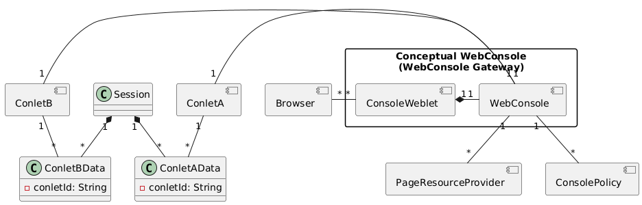 @startuml skinparam packageStyle rectangle allow_mixing component Browser package "Conceptual WebConsole\n(WebConsole Gateway)" { component WebConsole component ConsoleWeblet WebConsole "1" -left-* "1" ConsoleWeblet } ConsoleWeblet "*" -left- "*" Browser together { component ConletB WebConsole "1" -right- "1" ConletB component ConletA WebConsole "1" -right- "1" ConletA class ConletAData { -conletId: String } ConletAData "*" -up- "1" ConletA class ConletBData { -conletId: String } ConletBData "*" -up- "1" ConletB ConletAData "*" -up-* "1" Session ConletBData "*" -up-* "1" Session } component PageResourceProvider WebConsole "1" -down- "*" PageResourceProvider component ConsolePolicy WebConsole "1" -down- "*" ConsolePolicy @enduml