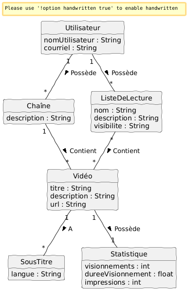 @startuml skinparam style strictuml skinparam backgroundcolor transparent skinparam defaultfontname xkcd Script skinparam handwritten true scale 1 hide empty members Utilisateur "1" -- "*" Chaîne : Possède > Chaîne "1" -- "*" Vidéo : Contient > Utilisateur "1" -- "*" ListeDeLecture : Possède > ListeDeLecture "*" -- "*" Vidéo : Contient > Vidéo "1" -- "*" SousTitre : A > Vidéo "1" -- "1" Statistique : Possède > class Vidéo { titre : String description : String url : String } class Utilisateur { nomUtilisateur : String courriel : String } class ListeDeLecture { nom : String description : String visibilite : String } class Chaîne { description : String } class SousTitre { langue : String } class Statistique { visionnements : int dureeVisionnement : float impressions : int } @enduml