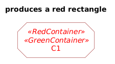 @startuml skinparam rectangle<<RedContainer>> { StereotypeFontColor red FontColor red BackgroundColor lightred BorderColor darkred RoundCorner 0 DiagonalCorner 18 } skinparam rectangle { StereotypeFontColor blue FontColor blue } skinparam rectangle<<ItalicContainer>> { FontStyle italic FontSize 8 } skinparam rectangle<<GreenContainer>> { StereotypeFontColor green FontColor green BackgroundColor lightgreen BorderColor darkgreen RoundCorner 15 DiagonalCorner 0 } title produces a red rectangle rectangle "C1" <<RedContainer>><<GreenContainer>> as C1 @enduml