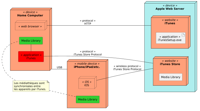 @startuml scale 0.7 left to right direction node "Apple Web Server" << device >>#PaleTurquoise { node iTunes as iTW << website >>#LightSalmon { artifact iTunesSetup.exe << application >> } node "iTunes Store" as iTS << website >>#LightSalmon { rectangle "Media Library" } } node "Home Computer" as HC << device >>#LightSalmon { node " " as wb << web browser >>#LightSalmon rectangle iTunes as iT << application >>#red rectangle "Media Library" as ML1 #LimeGreen iT - ML1 } node "iPhone/iPad/etc." as MD << mobile device >>#LightSalmon { node "iOS" as MDOS << OS >>#LightSalmon rectangle "Media Library" as ML2 #LimeGreen } note as N1 Les médiathèques sont synchronisées entre les appareils par iTunes. end note N1 .r. ML1 N1 .r. ML2 HC -- MD : USB iT -- iTS : << protocol >>\niTunes Store Protocol wb -- iTW : << protocol >>\nHTTP MDOS -- iTS : << wireless protocol >>\niTunes Store Protocol @enduml