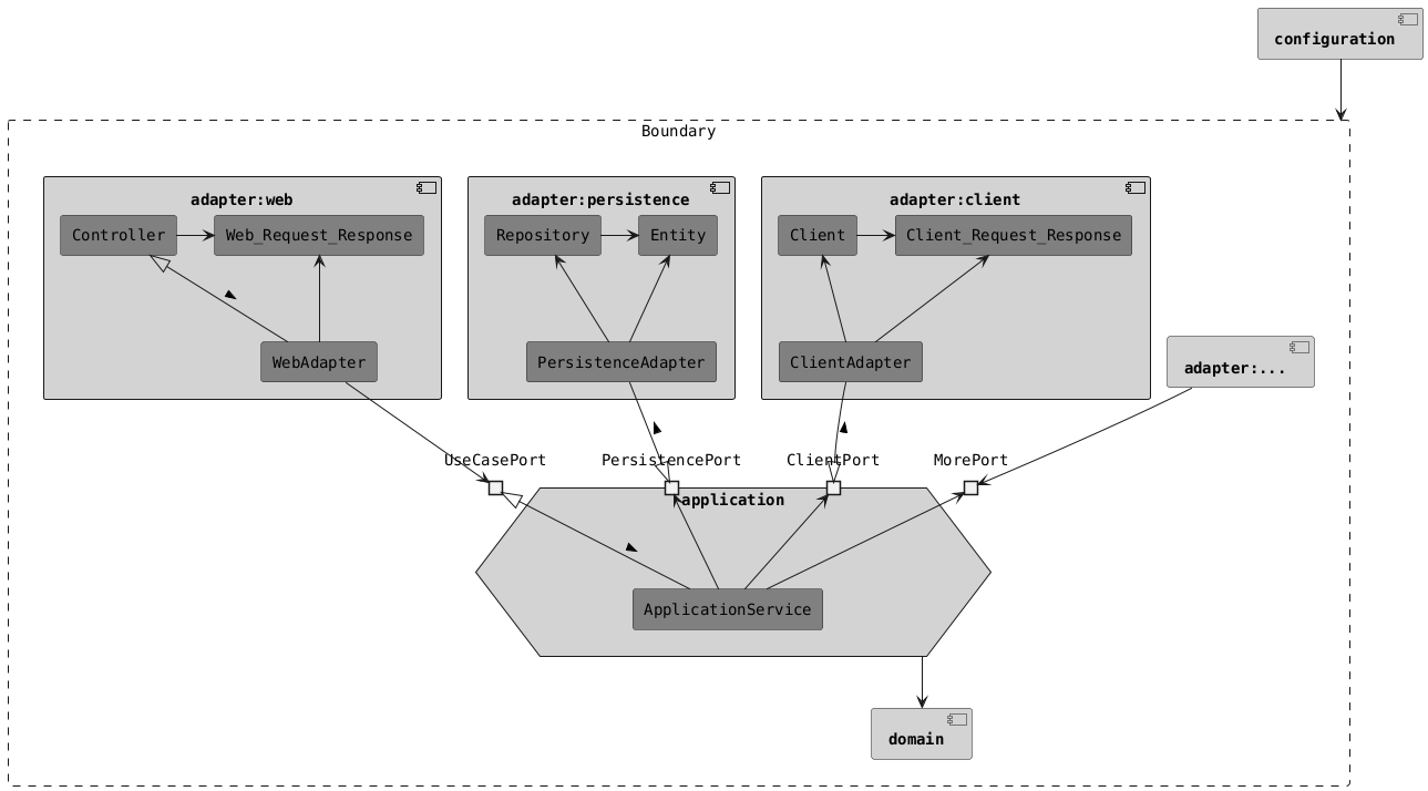 @startuml skinparam defaultFontName Fira Code, Monospaced skinparam RectangleBorderStyle<<Boundary>> dashed skinparam RectangleBackgroundColor<<Boundary>> White skinparam RectangleFontStyle<<Boundary>> normal skinparam RectangleBackgroundColor Gray skinparam ComponentBackgroundColor LightGray skinparam HexagonBackgroundColor LightGray skinparam ComponentFontStyle bold hide <<Boundary>> stereotype rectangle Boundary <<Boundary>> { hexagon application { port UseCasePort port PersistencePort port ClientPort port MorePort rectangle ApplicationService UseCasePort <|-- ApplicationService: > PersistencePort <-- ApplicationService ClientPort <-- ApplicationService MorePort <-- ApplicationService } application --> [domain] component adapter:web { rectangle Controller rectangle Web_Request_Response Controller -> Web_Request_Response rectangle WebAdapter Controller <|-- WebAdapter: > Web_Request_Response <-- WebAdapter } WebAdapter --> UseCasePort component adapter:persistence { rectangle Repository rectangle Entity Repository -> Entity rectangle PersistenceAdapter Repository <-- PersistenceAdapter Entity <-- PersistenceAdapter } PersistenceAdapter --|> PersistencePort: < component adapter:client { rectangle Client rectangle Client_Request_Response Client -> Client_Request_Response rectangle ClientAdapter Client <-- ClientAdapter Client_Request_Response <-- ClientAdapter } ClientAdapter --|> ClientPort: < [adapter:...] --> MorePort } [configuration] --> Boundary @enduml