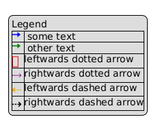 @startuml legend left Legend |<color:blue><size:18><&arrow-right></size></color> | some text| |<color:green><size:18><&arrow-right></size></color>| other text| |<color:red><size:18><U+2B38></size></color>|leftwards dotted arrow| |<color:purple><size:18><U+2911></size></color>|rightwards dotted arrow| |<color:orange><size:18><U+21E0></size></color>|leftwards dashed arrow| |<color:black><size:18><U+21E2></size></color>|rightwards dashed arrow| end legend @enduml