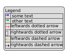 @startuml legend left Legend |<color:blue><size:18><&arrow-right></size></color> | some text| |<color:green><size:18><&arrow-right></size></color>| other text| |<color:red><size:18><U+2911></size></color>|leftwards dotted arrow| |<color:purple><size:18><U+2B38></size></color>|rightwards dotted arrow| |<color:orange><size:18><U+21E0></size></color>|leftwards dashed arrow| |<color:black><size:18><U+21E2></size></color>|rightwards dashed arrow| end legend @enduml