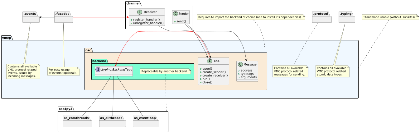 @startuml skinparam backgroundcolor transparent skinparam dpi 65 package vmcp #aliceblue { package .protocol {} note bottom of .protocol: Contains all available\nVMC protocol related\nmessages for sending. package .typing {} note bottom of .typing: Contains all available\nVMC protocol related\natomic data types. package .events {} note bottom of .events: Contains all available\nVMC protocol related\nevents, issued by\nincoming messages. package .facades {} note bottom of .facades: For easy usage\nof events (optional). .events <- .facades } note top of vmcp: Standalone usable (without <i>.facades</i>). package vmcp.osc #antiquewhite { class OSC { +open() +create_sender() +create_receiver() +run() +close() } package .channel { class Sender { +send() } class Receiver { +register_handler() +unregister_handler() } } class Message { +address +typetags +arguments } OSC <-- Receiver OSC <- Sender Sender --> Message Receiver <- .facades #red } note top of vmcp.osc: Requires to import the backend of choice (and to install it's dependencies). package vmcp.osc.backend #aquamarine { interface ".typing.BackendType" as BackendType package .osc4py3 { package as_eventloop {} package as_comthreads {} package as_allthreads {} } note bottom of .osc4py3: Replaceable by another backend. BackendType -- as_eventloop BackendType -- as_comthreads BackendType -- as_allthreads OSC -> BackendType #red } @enduml