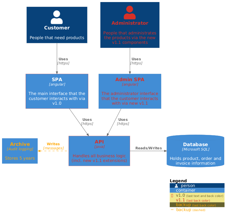 @startuml !include https://raw.githubusercontent.com/plantuml-stdlib/C4-PlantUML/v2.13.0/C4_Container.puml AddElementTag("v1.0", $borderColor="#d73027") AddElementTag("v1.1", $fontColor="#d73027") AddElementTag("backup", $fontColor="orange") AddRelTag("backup", $textColor="orange", $lineColor="orange", $lineStyle = DashedLine()) Person(user, "Customer", "People that need products") Person(admin, "Administrator", "People that administrates the products via the new v1.1 components", $tags="v1.1") Container(spa, "SPA", "angular", "The main interface that the customer interacts with via v1.0", $tags="v1.0") Container(spaAdmin, "Admin SPA", "angular", "The administrator interface that the customer interacts with via new v1.1", $tags="v1.1") Container(api, "API", "java", "Handles all business logic (incl. new v1.1 extensions)", $tags="v1.0+v1.1") ContainerDb(db, "Database", "Microsoft SQL", "Holds product, order and invoice information") Container(archive, "Archive", "Audit logging", "Stores 5 years", $tags="backup") Rel(user, spa, "Uses", "https") Rel(spa, api, "Uses", "https") Rel_R(api, db, "Reads/Writes") Rel(admin, spaAdmin, "Uses", "https") Rel(spaAdmin, api, "Uses", "https") Rel_L(api, archive, "Writes", "messages", $tags="backup") SHOW_LEGEND() @enduml