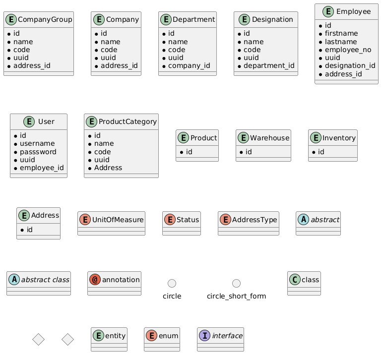 @startuml entity CompanyGroup { * id * name * code * uuid * address_id } entity Company { * id * name * code * uuid * address_id } entity Department { * id * name * code * uuid * company_id } entity Designation { * id * name * code * uuid * department_id } entity Employee { * id * firstname * lastname * employee_no * uuid * designation_id * address_id } entity User { * id * username * passsword * uuid * employee_id } entity ProductCategory { * id * name * code * uuid * Address } entity Product { * id } entity Warehouse { * id } entity Inventory { * id } entity Address { * id } enum UnitOfMeasure enum Status enum AddressType abstract abstract abstract class "abstract class" annotation annotation circle circle () circle_short_form class class diamond diamond <> diamond_short_form entity entity enum enum interface interface @enduml