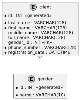 @startuml entity "gender" as g { * id : INT <<generated>> -- * name : VARCHAR(10) } entity "client"{ * id : INT <<generated>> -- * last_name : VARCHAR(128) * first_name : VARCHAR(128) middle_name : VARCHAR(128) full_name : VARCHAR(128) gender_id : INT <<FK>> * phone_number : VARCHAR(128) * registration_date : DATETIME } client }|..|| g @enduml