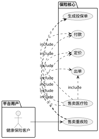 @startuml left to right direction package 平台用户 { actor "健康保险客户" as c } package 保险核心 { usecase "售卖重疾险" as majarDiseaseInsuranceCase usecase "生成投保单" as createOrder usecase "付款" as payment usecase "定价" as pricing usecase "出单" as issueOrder usecase "售卖医疗险" as medicalInsuranceCase (majarDiseaseInsuranceCase) .> (createOrder) : include (majarDiseaseInsuranceCase) .> (payment) : include (majarDiseaseInsuranceCase) .> (pricing) : include (majarDiseaseInsuranceCase) .> (issueOrder) : include (medicalInsuranceCase) .> (createOrder) : include (medicalInsuranceCase) .> (payment) : include (medicalInsuranceCase) .> (pricing) : include (medicalInsuranceCase) .> (issueOrder) : include } c --> majarDiseaseInsuranceCase @enduml