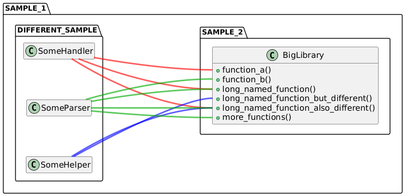 @startuml left to right direction skinparam nodesep 80 skinparam ranksep 200 skinparam ClassAttributeFontSize 16 skinparam arrowThickness 3 hide empty member !define my_red FF0000A0 !define my_blue 0000FFA0 !define my_green 00AA00A0 package "SAMPLE_1" as pkgsmp1 { package "SAMPLE_2" as pkgsmp2 { class "BigLibrary" as lib { + function_a() + function_b() + long_named_function() + long_named_function_but_different() + long_named_function_also_different() + more_functions() } } package "DIFFERENT_SAMPLE" { class "SomeHandler" as handler class "SomeHelper" as helper class "SomeParser" as parser } } handler -[#my_red]- lib::function_a handler -[#my_red]- lib::long_named_function handler -[#my_red]- lib::long_named_function_also_different helper -[#my_blue]- lib::long_named_function_also_different helper -[#my_blue]- lib::long_named_function_but_different parser -[#my_green]- lib::function_b parser -[#my_green]- lib::more_functions parser -[#my_green]- lib::long_named_function_also_different parser -[#my_green]- lib::long_named_function @enduml