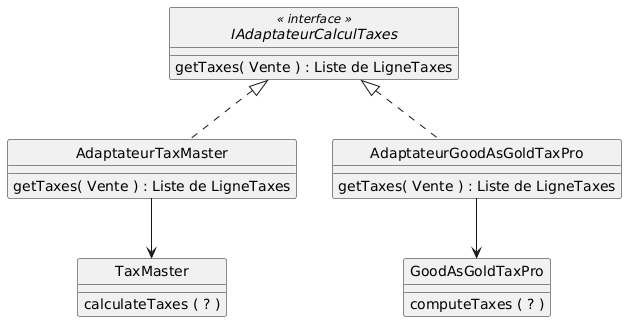 @startuml skinparam style strictuml skinparam defaultFontName Helvetica,Arial,sans-serif skinparam backgroundcolor transparent interface IAdaptateurCalculTaxes << interface >> class AdaptateurTaxMaster implements IAdaptateurCalculTaxes class AdaptateurGoodAsGoldTaxPro implements IAdaptateurCalculTaxes IAdaptateurCalculTaxes : getTaxes( Vente ) : Liste de LigneTaxes AdaptateurTaxMaster : getTaxes( Vente ) : Liste de LigneTaxes AdaptateurGoodAsGoldTaxPro : getTaxes( Vente ) : Liste de LigneTaxes class TaxMaster { calculateTaxes ( ? ) } class GoodAsGoldTaxPro { computeTaxes ( ? ) } AdaptateurTaxMaster -d-> TaxMaster AdaptateurGoodAsGoldTaxPro -d-> GoodAsGoldTaxPro @enduml