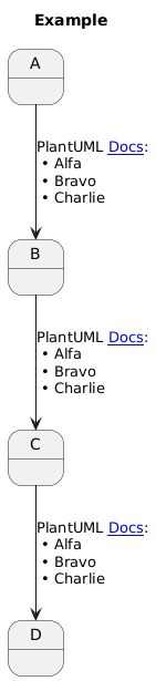 @startuml skinparam defaultTextAlignment left !$bullet = "<U+2022>" !define PLANTUML_DOCS_1 [[https://plantuml.com/ Docs]] !function $plantuml_docs_2() !return "[[https://plantuml.com/ Docs]]" !endfunction title Example state A state B state C state D A --> B : PlantUML [[https://plantuml.com/ Docs]]:\n $bullet Alfa\n $bullet Bravo\n $bullet Charlie B --> C : PlantUML PLANTUML_DOCS_1:\n $bullet Alfa\n $bullet Bravo\n $bullet Charlie C --> D : PlantUML $plantuml_docs_2():\n $bullet Alfa\n $bullet Bravo\n $bullet Charlie @enduml