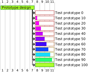 @startgantt <style> ganttDiagram { task { BackGroundColor GreenYellow LineColor Green unstarted { BackGroundColor Fuchsia LineColor FireBrick } } } </style> [Prototype design] lasts 7 days [Test prototype 0] lasts 4 days [Test prototype 10] lasts 4 days [Test prototype 20] lasts 4 days [Test prototype 30] lasts 4 days [Test prototype 40] lasts 4 days [Test prototype 50] lasts 4 days [Test prototype 60] lasts 4 days [Test prototype 70] lasts 4 days [Test prototype 80] lasts 4 days [Test prototype 90] lasts 4 days [Test prototype 100] lasts 4 days [Test prototype 0] starts at [Prototype design]'s end [Test prototype 10] starts at [Prototype design]'s end [Test prototype 20] starts at [Prototype design]'s end [Test prototype 30] starts at [Prototype design]'s end [Test prototype 40] starts at [Prototype design]'s end [Test prototype 50] starts at [Prototype design]'s end [Test prototype 60] starts at [Prototype design]'s end [Test prototype 70] starts at [Prototype design]'s end [Test prototype 80] starts at [Prototype design]'s end [Test prototype 90] starts at [Prototype design]'s end [Test prototype 100] starts at [Prototype design]'s end [Test prototype 0] is 0% complete [Test prototype 10] is 10% complete [Test prototype 20] is 20% complete [Test prototype 30] is 30% complete [Test prototype 40] is 40% complete [Test prototype 50] is 50% complete [Test prototype 60] is 60% complete [Test prototype 70] is 70% complete [Test prototype 80] is 80% complete [Test prototype 90] is 90% complete [Test prototype 100] is 100% complete @endgantt