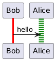 @startuml <STYLE> sequenceDiagram { .bob_style { ShowStereotype false Lifeline { linecolor red linestyle solid lineThickness 3 } } .alice_style { ShowStereotype false Lifeline { linecolor green linestyle 2 lineThickness 10 } } } </STYLE> participant Bob <<bob_style>> participant Alice <<alice_style>> Bob -> Alice : hello @enduml
