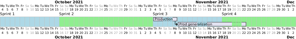 @startgantt Project starts 2021-10-04 saturday are closed sunday are closed 2021-10-26 is closed 2021-10-27 is closed 2021-10-28 is closed 2021-10-04 and 10 days are colored in lightblue and are named [Sprint 1] then 10 days are colored in lightgreen and are named [Sprint 2] then 10 days are colored in lightblue and are named [Sprint 3] then 10 days are colored in lightgreen and are named [Sprint 4] [Production] lasts 3 days and starts at [Sprint 3]'s start then [Prod generalization] lasts 10 days @endgantt