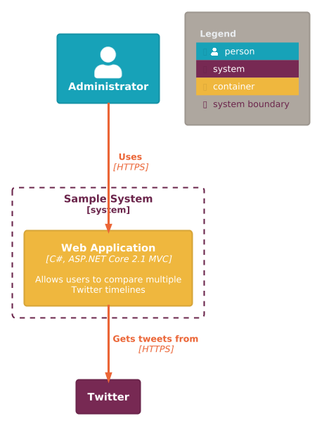 @startuml !theme C4_united from https://raw.githubusercontent.com/plantuml-stdlib/C4-PlantUML/master/themes !include https://raw.githubusercontent.com/plantuml-stdlib/C4-PlantUML/master/C4_Container.puml Person(admin, "Administrator") System_Boundary(c1, "Sample System") { Container(web_app, "Web Application", "C#, ASP.NET Core 2.1 MVC", "Allows users to compare multiple Twitter timelines") } System(twitter, "Twitter") Rel(admin, web_app, "Uses", "HTTPS") Rel(web_app, twitter, "Gets tweets from", "HTTPS") SHOW_FLOATING_LEGEND() @enduml