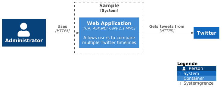 @startuml !theme C4Language_german from https://raw.githubusercontent.com/plantuml-stdlib/C4-PlantUML/v2.13.0/themes !include https://raw.githubusercontent.com/plantuml-stdlib/C4-PlantUML/v2.13.0/C4_Container.puml LAYOUT_LANDSCAPE() Person(admin, "Administrator") System_Boundary(c1, 'Sample') { Container(web_app, "Web Application", "C#, ASP.NET Core 2.1 MVC", "Allows users to compare multiple Twitter timelines") } System(twitter, "Twitter") Rel(admin, web_app, "Uses", "HTTPS") Rel(web_app, twitter, "Gets tweets from", "HTTPS") SHOW_LEGEND() @enduml