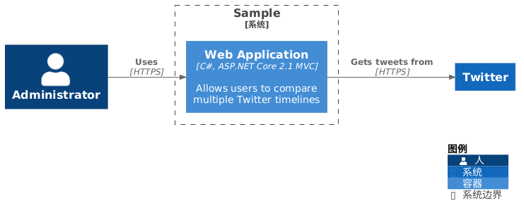 @startuml !theme C4Language_chinese from https://raw.githubusercontent.com/plantuml-stdlib/C4-PlantUML/v2.13.0/themes !include https://raw.githubusercontent.com/plantuml-stdlib/C4-PlantUML/v2.13.0/C4_Container.puml LAYOUT_LANDSCAPE() Person(admin, "Administrator") System_Boundary(c1, 'Sample') { Container(web_app, "Web Application", "C#, ASP.NET Core 2.1 MVC", "Allows users to compare multiple Twitter timelines") } System(twitter, "Twitter") Rel(admin, web_app, "Uses", "HTTPS") Rel(web_app, twitter, "Gets tweets from", "HTTPS") SHOW_LEGEND() @enduml