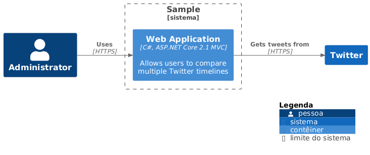 @startuml !theme C4Language_portuguese from https://raw.githubusercontent.com/plantuml-stdlib/C4-PlantUML/master/themes !include https://raw.githubusercontent.com/plantuml-stdlib/C4-PlantUML/master/C4_Container.puml LAYOUT_LANDSCAPE() Person(admin, "Administrator") System_Boundary(c1, 'Sample') { Container(web_app, "Web Application", "C#, ASP.NET Core 2.1 MVC", "Allows users to compare multiple Twitter timelines") } System(twitter, "Twitter") Rel(admin, web_app, "Uses", "HTTPS") Rel(web_app, twitter, "Gets tweets from", "HTTPS") SHOW_LEGEND() @enduml